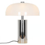 O candeeiro de mesa Gabrielle combina o acabamento brilhante cromado com o brilho do vidro opalino, uma elegante mistura de materiais nobres.